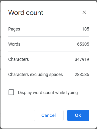 What you’re looking at below is the word and page count (single-spaced) of a book I started writing in February. This is only the first draft, but now that that’s done, I can start the editing and rewriting process.